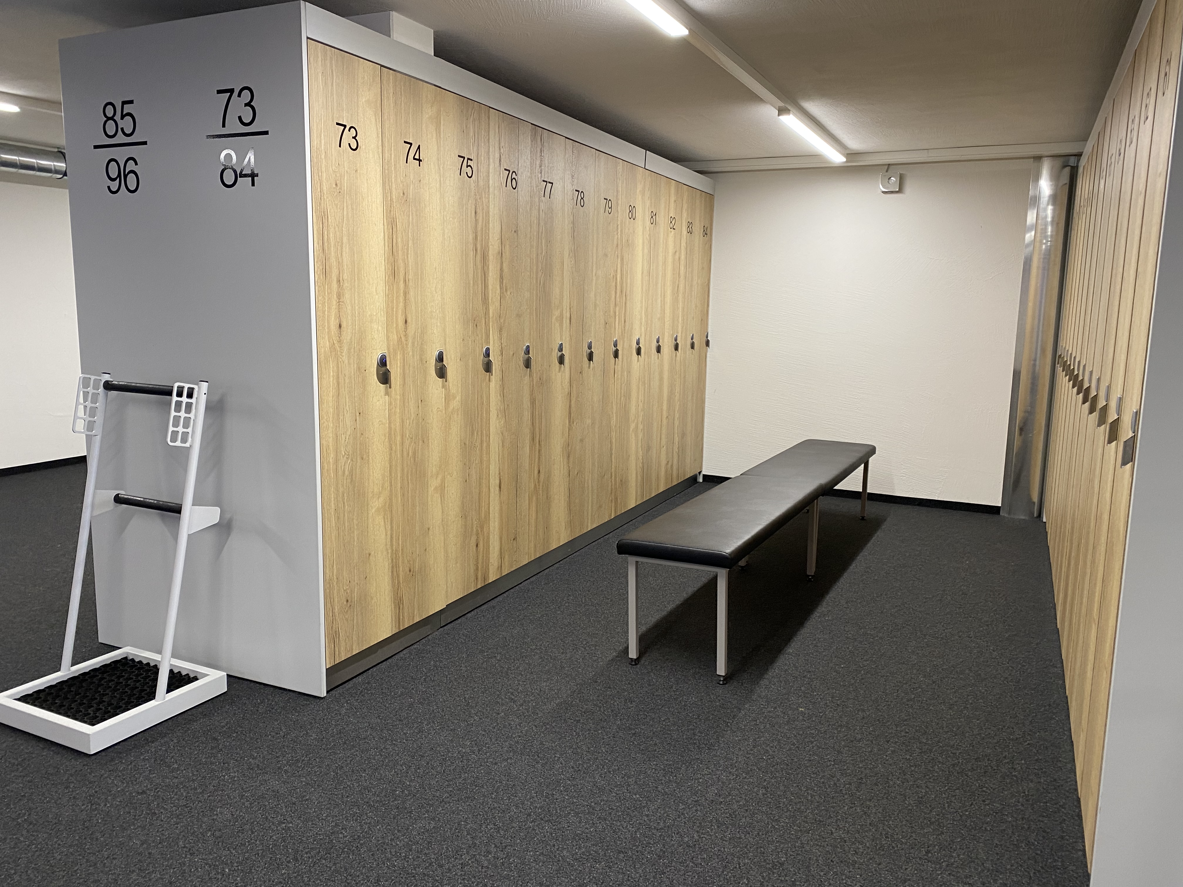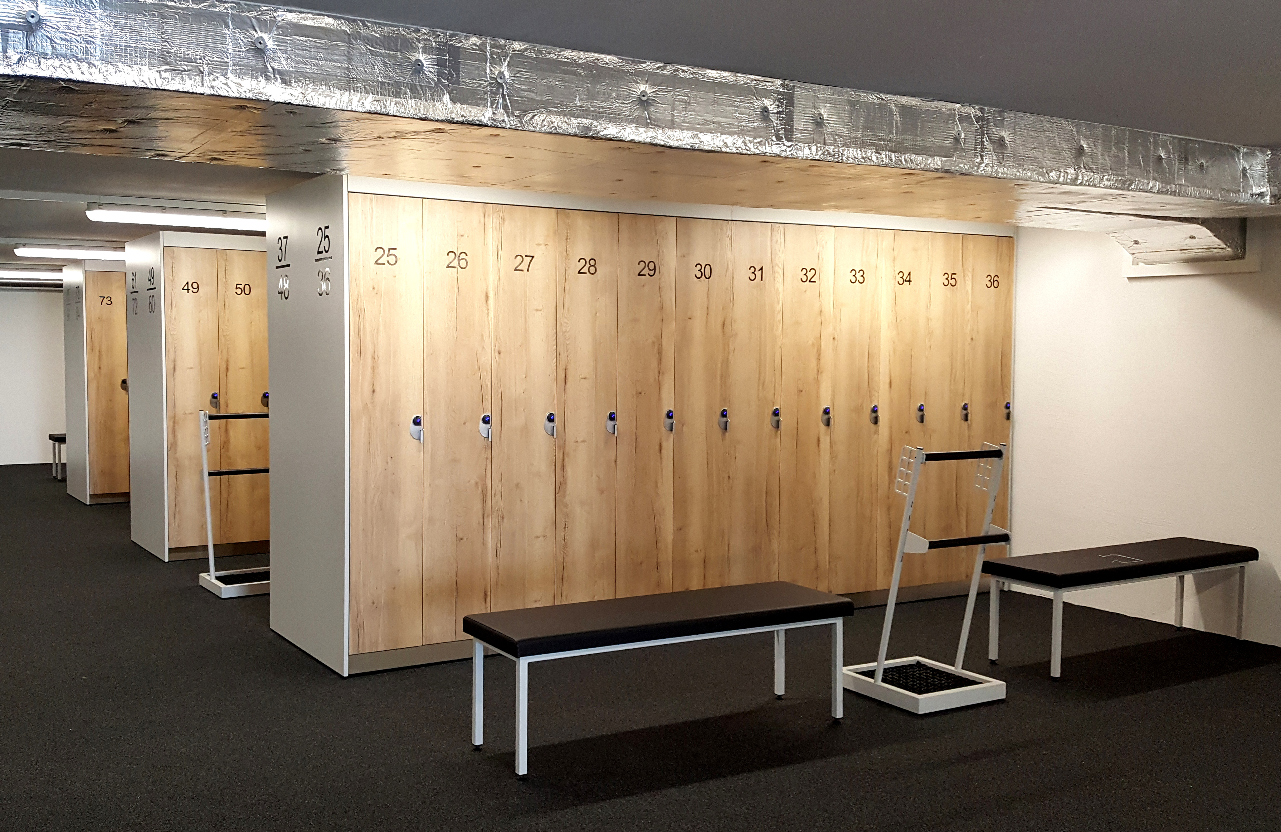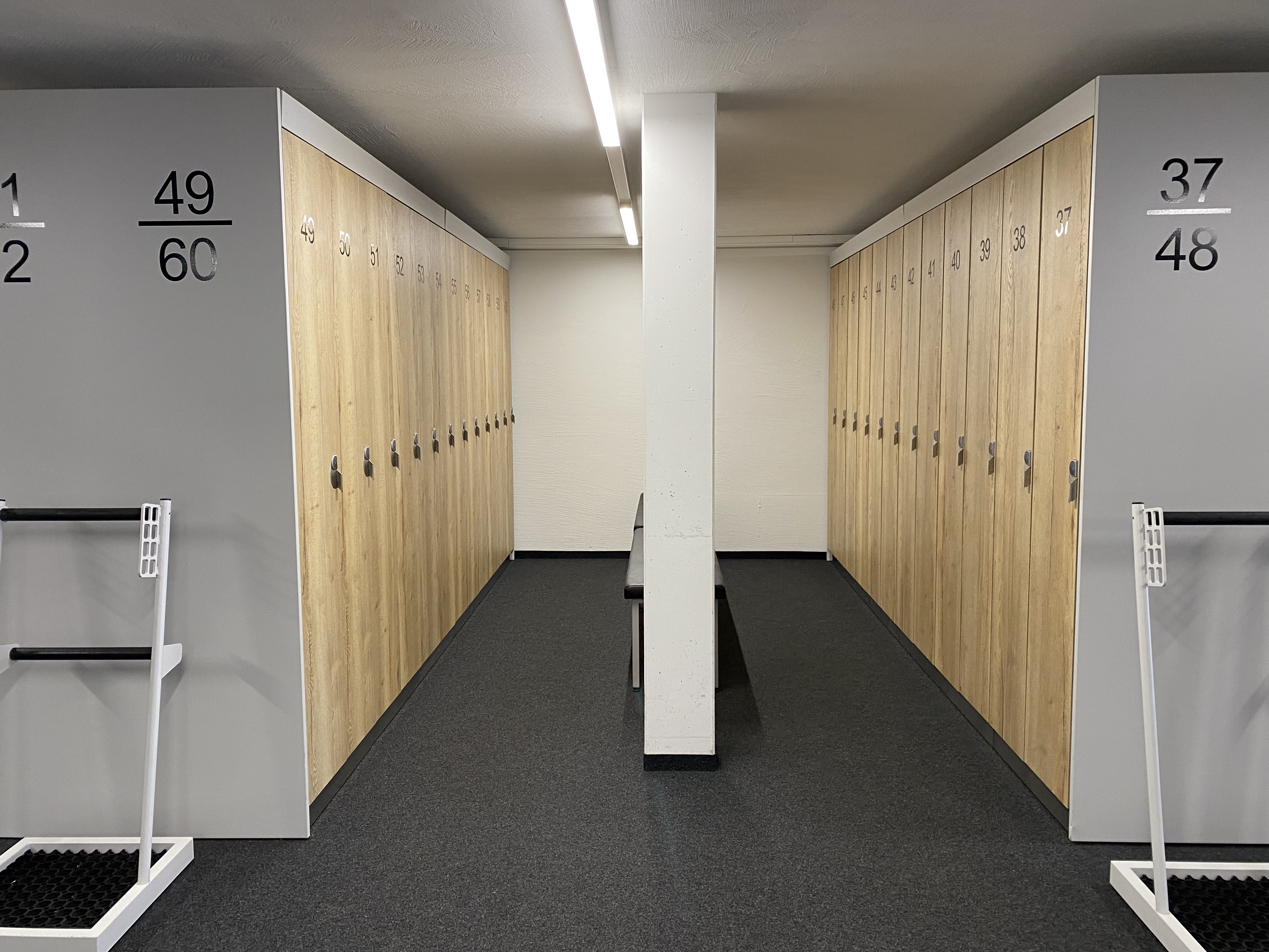 The benches between the rows of lockers allow you to comfortably put on and take off your boots. The lockers can accommodate the ski equipment of 2 adults and 1 child under 10 (2 pairs of skis with poles, 2 pairs of ski boots, 2 helmets plus children's skis with poles, children's ski boots and children's helmet). The lockers are 33cm wide, 45cm deep and 200cm high.
