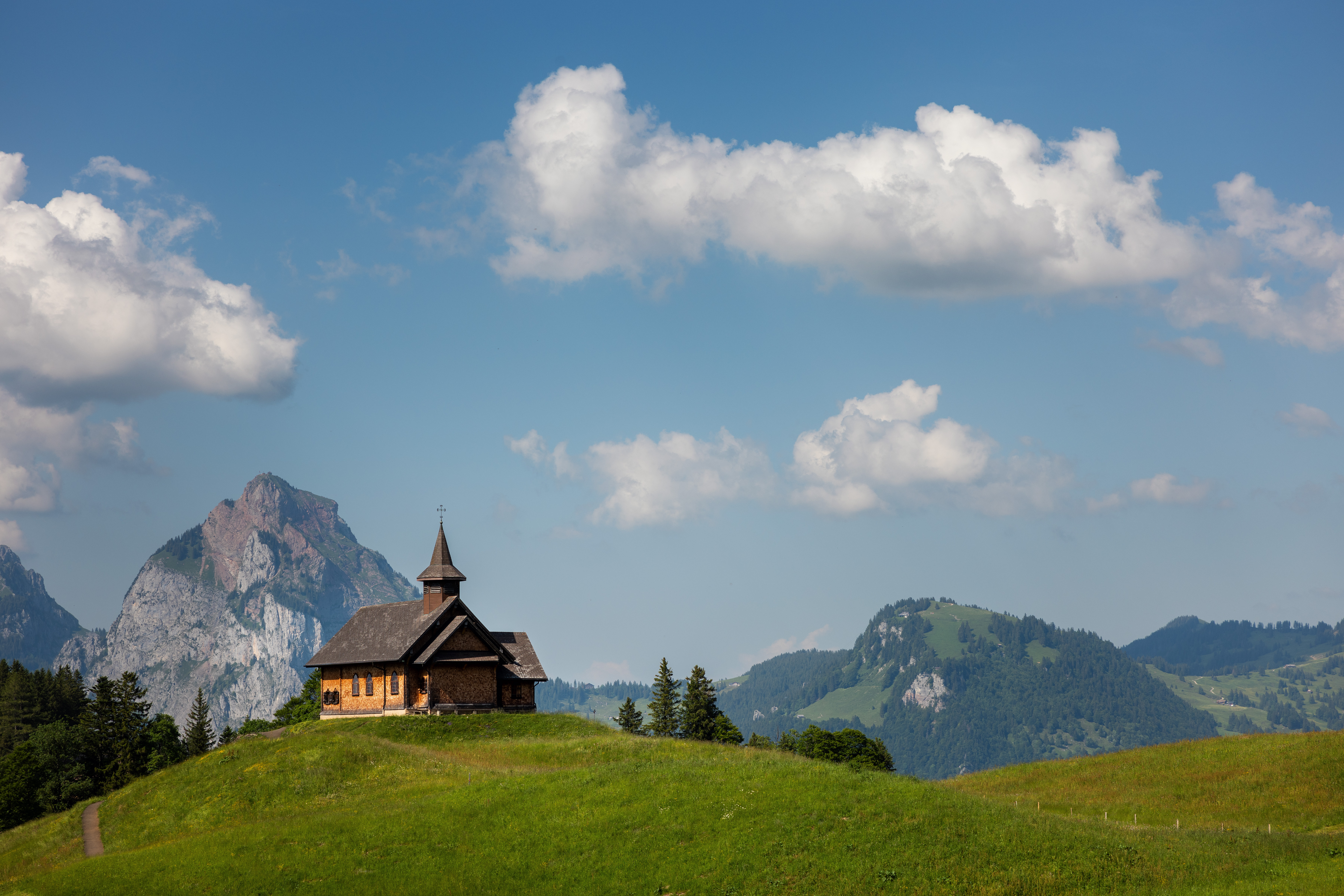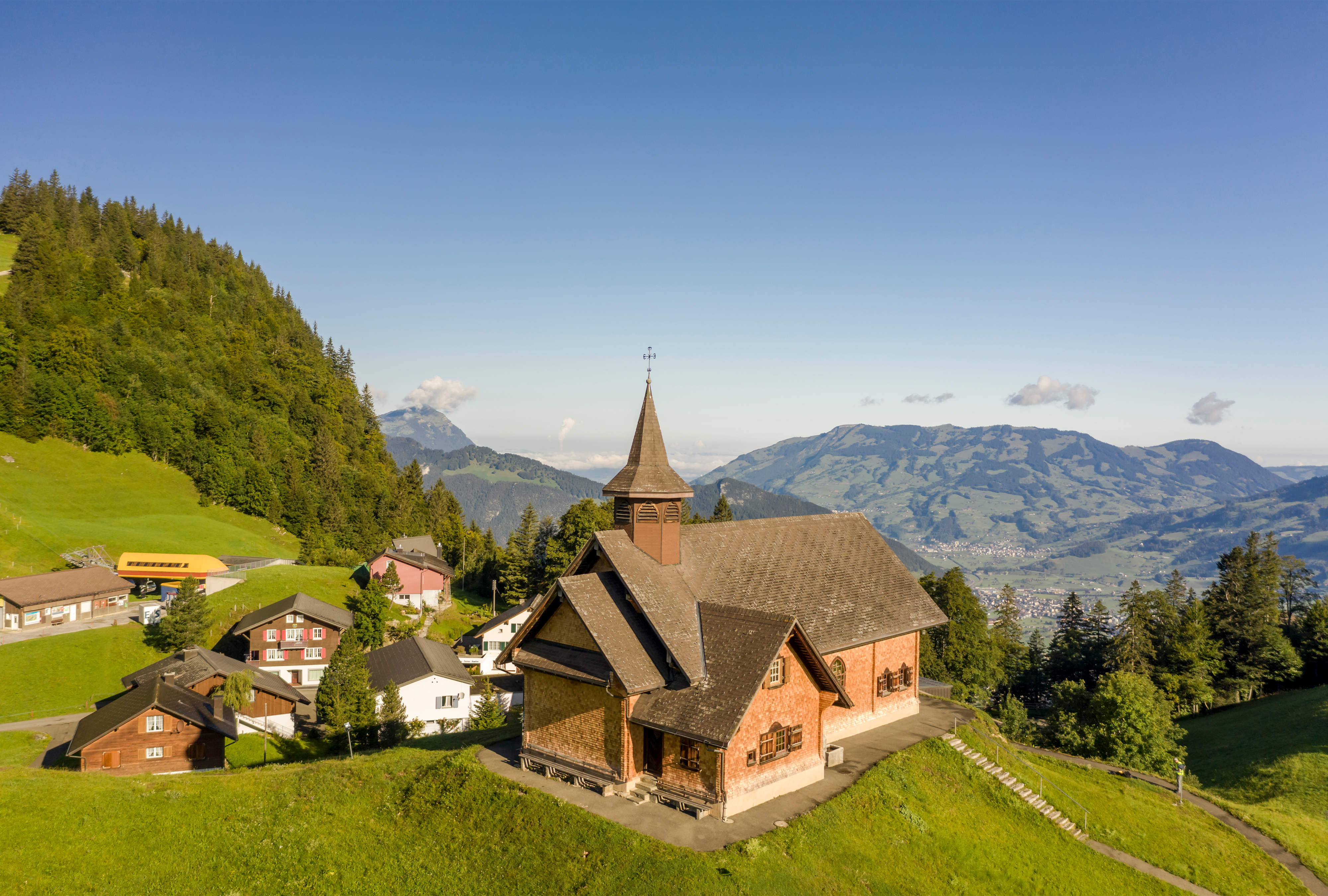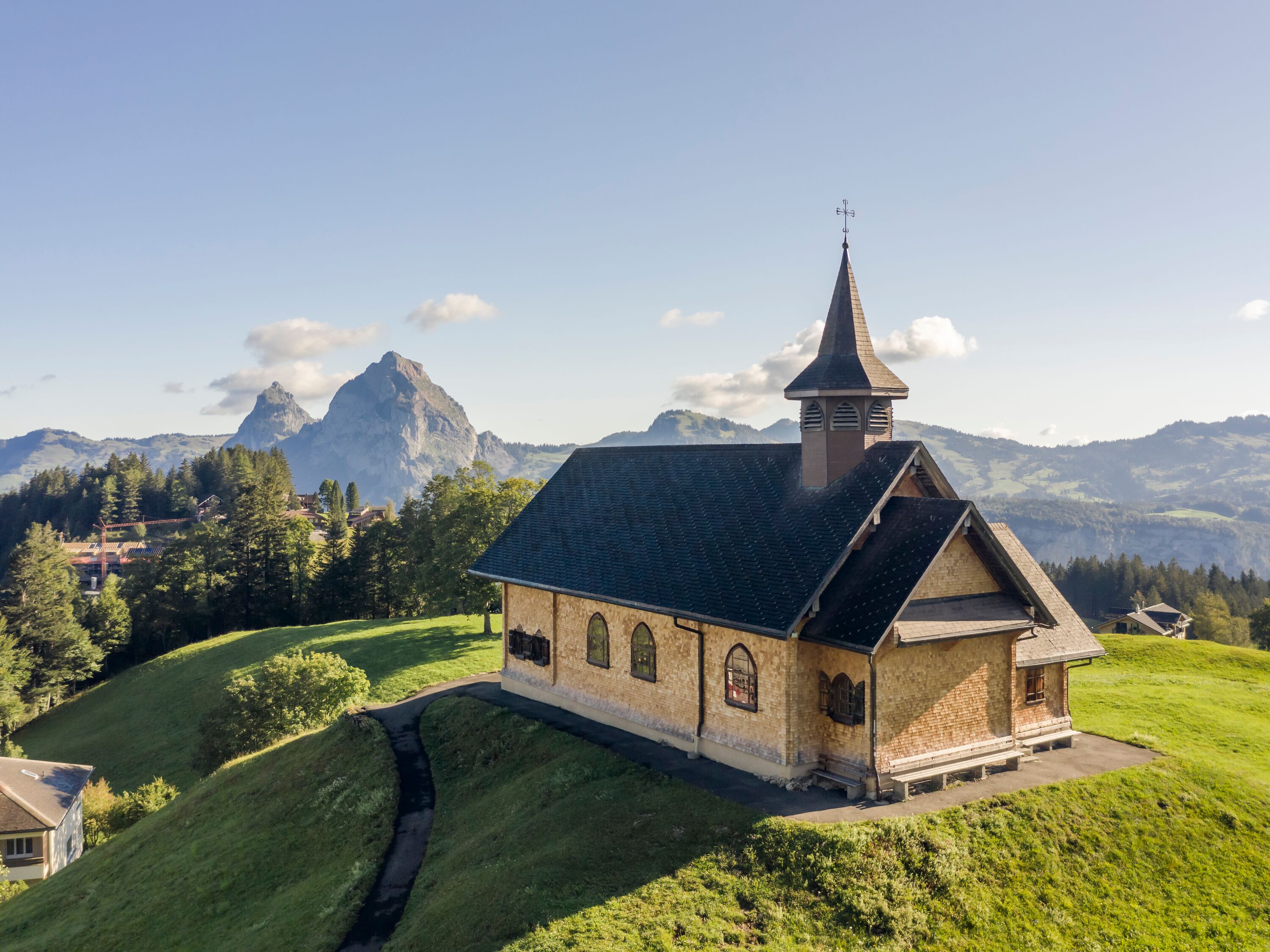 In the middle of the idyllic mountain village of Stoos is the Maria Hilf Chapel. The small mountain chapel was consecrated in 1932 and services are still held there today. Many wedding couples say "I do" in the mountain chapel. In the evening it is beautifully illuminated.